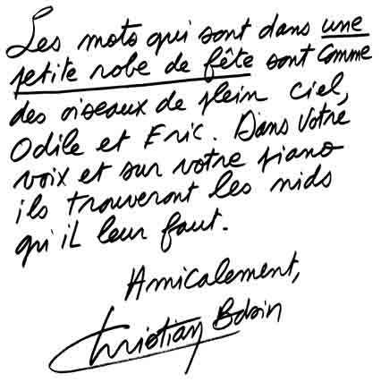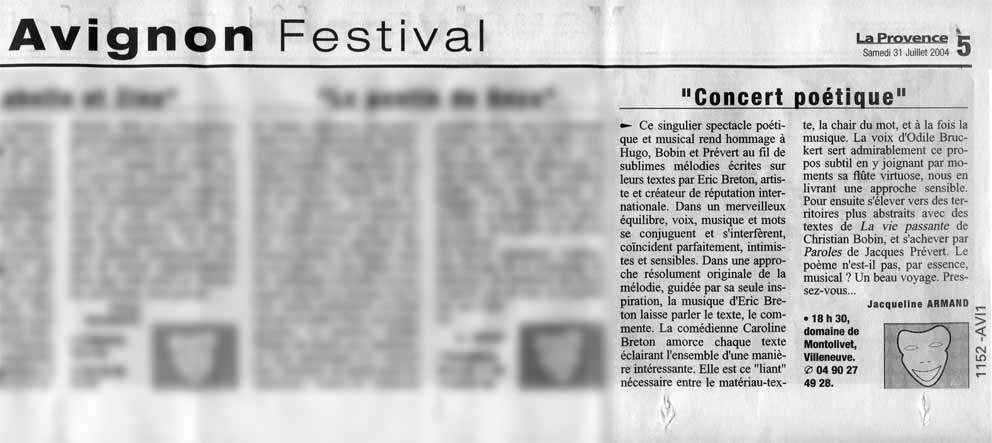 Dans une approche résolument originale de la mélodie, guidé par sa seule inspiration, Eric Breton laisse parler le texte. Hugo, Bobin*, Prévert prêtent leurs mots et la musique vient d'elle-même, naturelle et évidente. La voix d'Odile Bruckert sert admirablement ce propos harmonieux et subtil, en y joignant par moment sa flûte virtuose. Le piano, omniprésent, soutient, commente et complète le tout.
