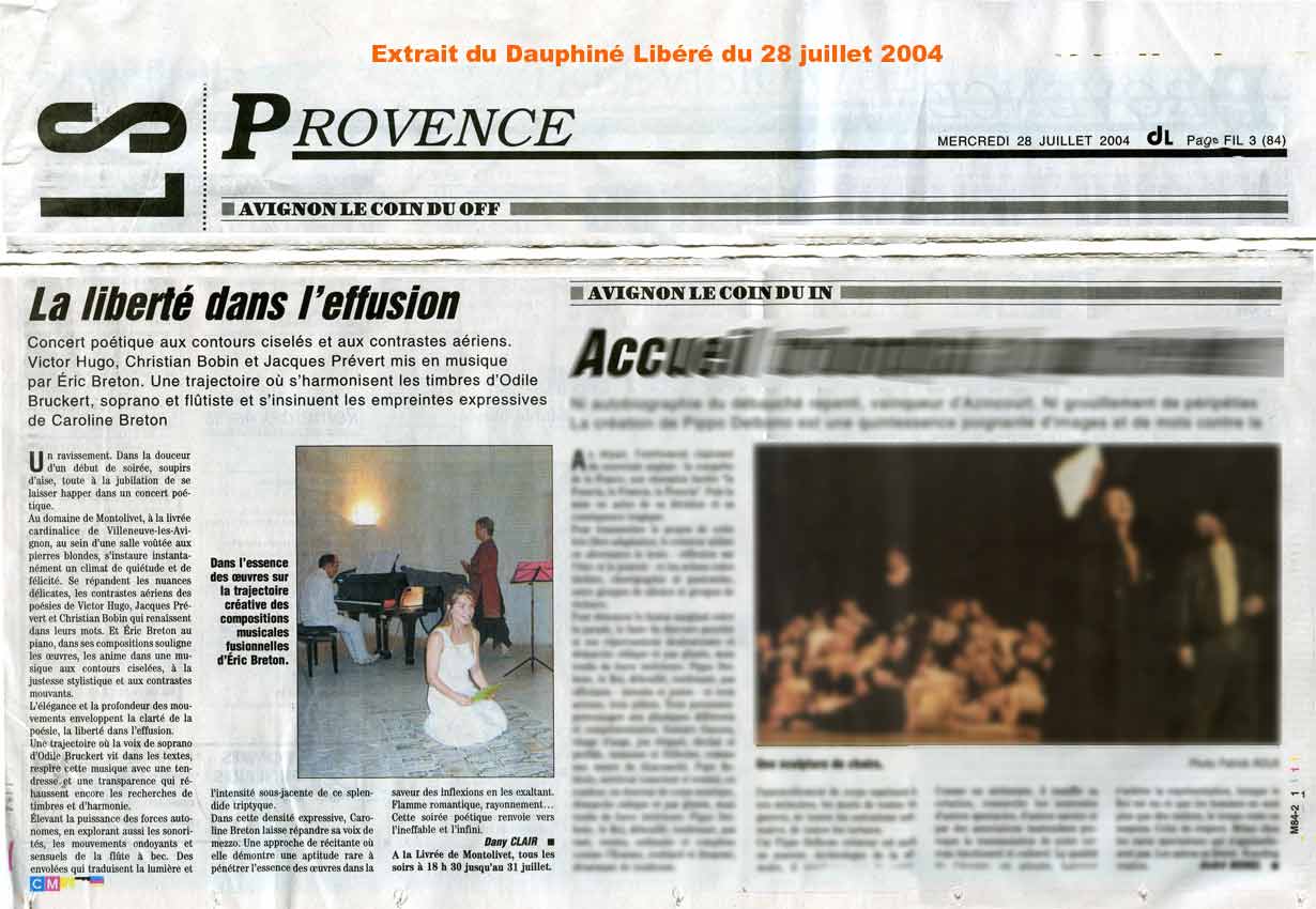 Dans une approche résolument originale de la mélodie, guidé par sa seule inspiration, Eric Breton laisse parler le texte. Hugo, Bobin*, Prévert prêtent leurs mots et la musique vient d'elle-même, naturelle et évidente. La voix d'Odile Bruckert sert admirablement ce propos harmonieux et subtil, en y joignant par moment sa flûte virtuose. Le piano, omniprésent, soutient, commente et complète le tout.