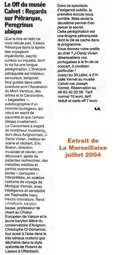 Ce spectacle, créé au Musée Calvet pour le festival Avignon off, se compose de lettres, de poèmes, de récits de voyages et d’extraits du Canzoniere, mis en musique. Ce voyage en mots et en musique, mêle, non sans humour, la poésie et la prose de Pétrarque aux musiques suscitées au fil des siècles chez les compositeurs parfois les plus inattendus. En effet, les mélodies ou les extraits d’opéras présentés ici sont tous inédits et témoignent des regards successifs que chaque époque a apporté, du 16ème siècle à nos jours, sur cette œuvre fondatrice de la poésie européenne. Cette pérégrination « poético-musicale » entraîne le spectateur dans un dialogue à plusieurs voix sur les chemins subtils de l’Amour. Après de longues et patientes recherches, Jean-Denis Vivien et Eric Breton ont exhumé quelques perles « baroques » qui témoignent de l’infinie et surprenante richesse du pétrarquisme.
